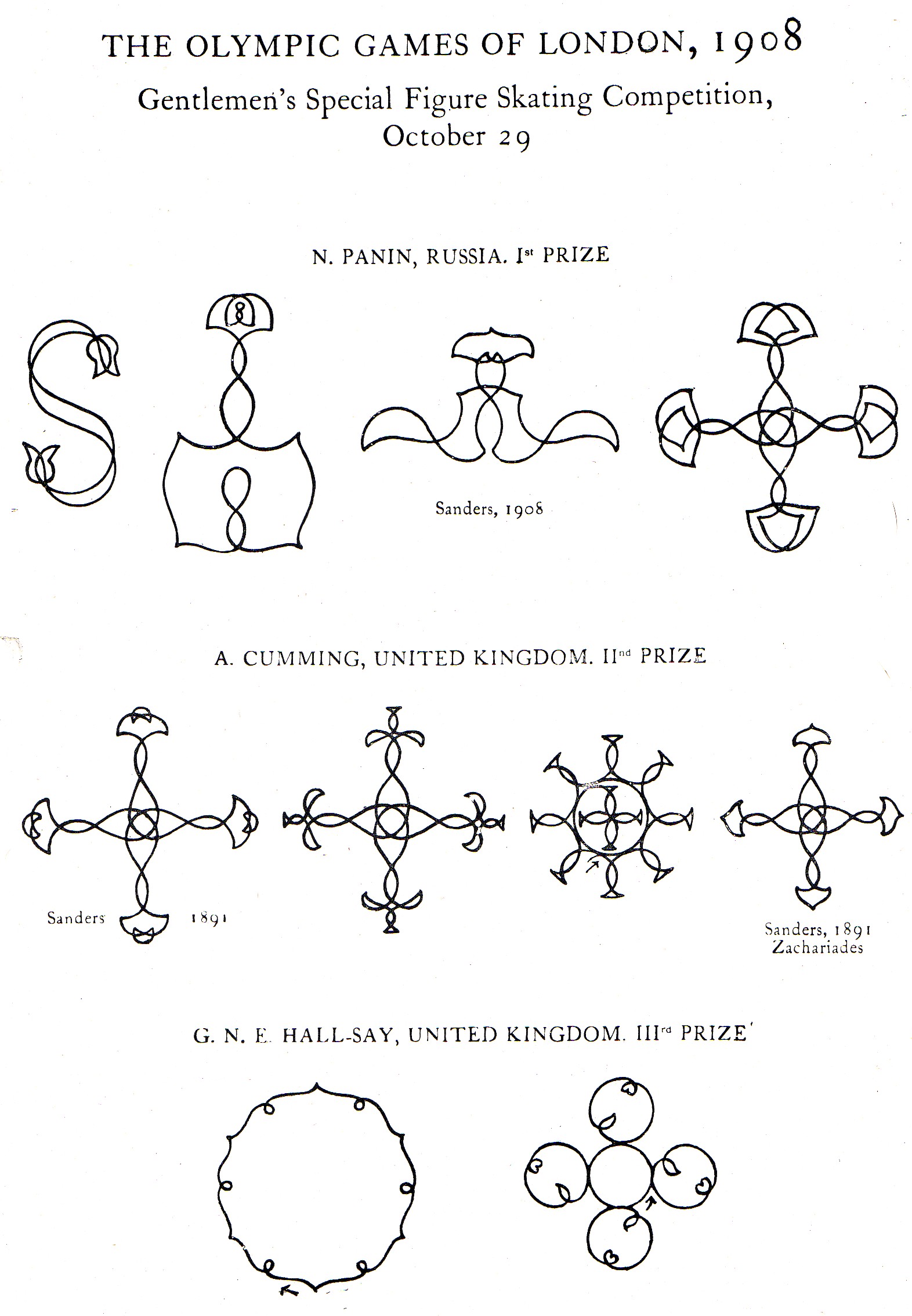 According to Mr. George Sanders (American), the Most Famous Designer of Special Figures in the World, special figures, 'are all those figures designs which by their nature spoil the harmony of free skating...they ought, as far as possible, to be original, the creations of the artisitc faculty of each individual and a proof of his ability to adapt, combine and harmonize.'